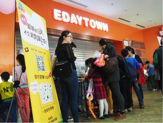现在,小镇门口聚集的孩子越来越多。星期8小镇的一家合作企业、儿童习惯养成类APP“未来岛”团队已在门口摆好展位,他们通过贴纸吸引小朋友,通过E币吸引大人。