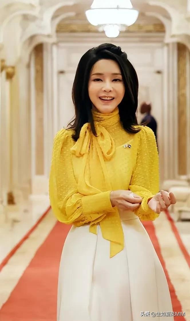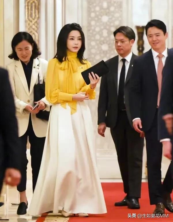 第一夫人出访时这身晚宴装更是惊艳!薄纱黄衣配拖地白裙,太仙了。