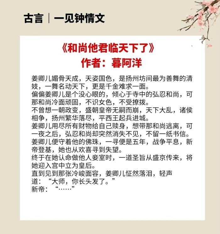 短评:高冷和尚男主×貌美清ji女主,女主角曾经是官家小姐,一朝落魄成为清j,即将被当成玩物被献给权贵之时,幸好有和尚(男主角)出手相助才得以幸免。先前,女主角曾在雪夜借宿男主角的寺院,那时的她就对男主一见钟情,开始各种撩拨。男主角几次退让,架不住女主角会撩,两个人互通心意,最终确定关系。然后女主角打算为自己赎身与男主角在一起之时,男主角母妃被害,还俗做回了他的太子,决心登上皇位,再回来迎娶女主角。中间男主角假死成为了平西王,可怜女主角不知道内情,痛不欲生,还打算刺杀平西王为男主报仇。男主角不得不披着马甲来了一场强取豪夺,后来男主重回登基为帝,想把女主角接到身边封为皇后。女主角才发现自己被男主骗了,准备另嫁他人。男主追妻火葬场的故事。