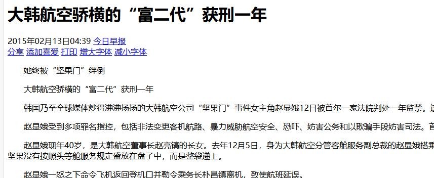 根据今日早报的报道,这个事情刊登于2015年2月13日发布的《大韩航空骄横的“富二代”获刑一年》