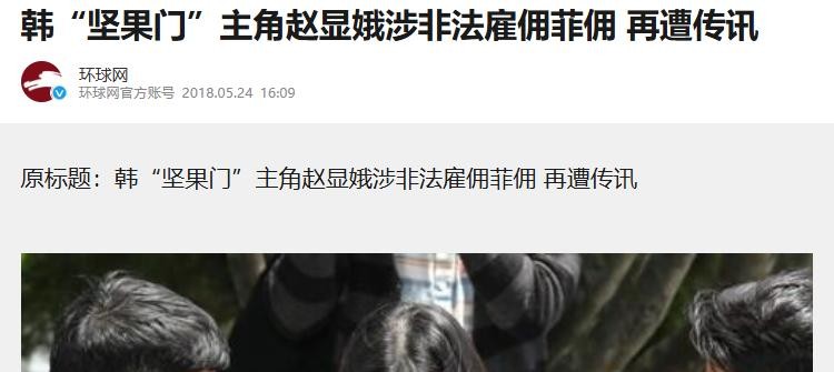 根据环球时报的报道,这个事情刊登于2018年5月24日发布的《韩“坚果门”主角赵显娥涉非法雇佣菲佣 再遭传讯》