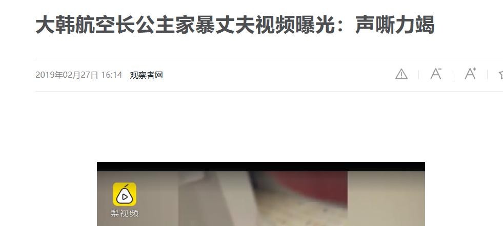 根据观察者网的报道,这个事情刊登于2019年2月27日发布的《大韩航空长公主家暴丈夫视频曝光:声嘶力竭》