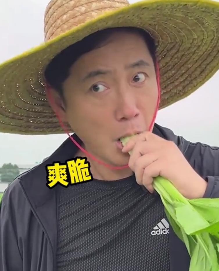 只见彭新智带着农村常见的草帽,在菜地里卖力地收菜,累了就坐在路边,大口大口吃着新鲜采摘的菜心,丝毫不顾及演员形象。