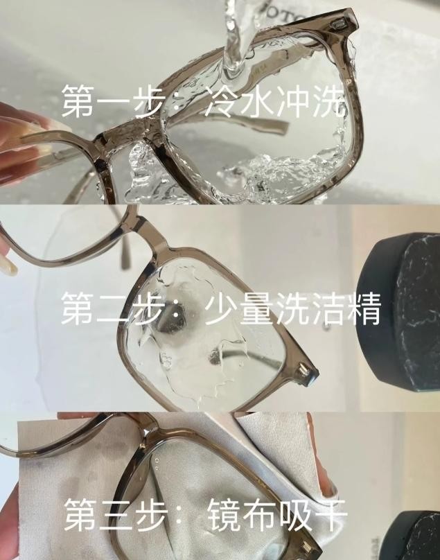 先用温水冲洗镜片,去除表面灰尘;然后用专业眼镜清洁剂或温和的洗洁精清洗,这一步能去除镜片上的油污和顽固污渍;