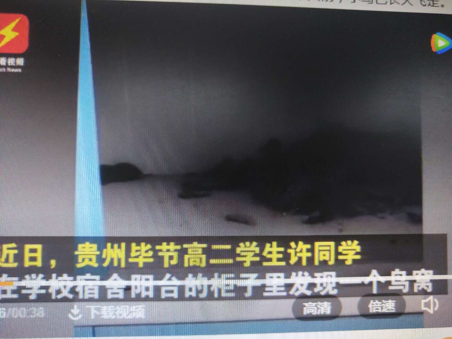 近日,贵州毕节高二学生许同学在学校宿舍阳台的柜子里发现一个鸟窝。许同学称有5个多月没回宿舍,宿舍阳台是开放式的,放假走时柜子没关门。鸟窝中共有4只小鸟,许同学称拍了视频后就再也没打扰它们,自己在阳台放了坚果,有看见大鸟把坚果叼到了窝中。不久前,小鸟已长大飞走。3、消防高速路上给鸡洗澡降温,5000余只“高温鸡”秒变“落汤鸡”