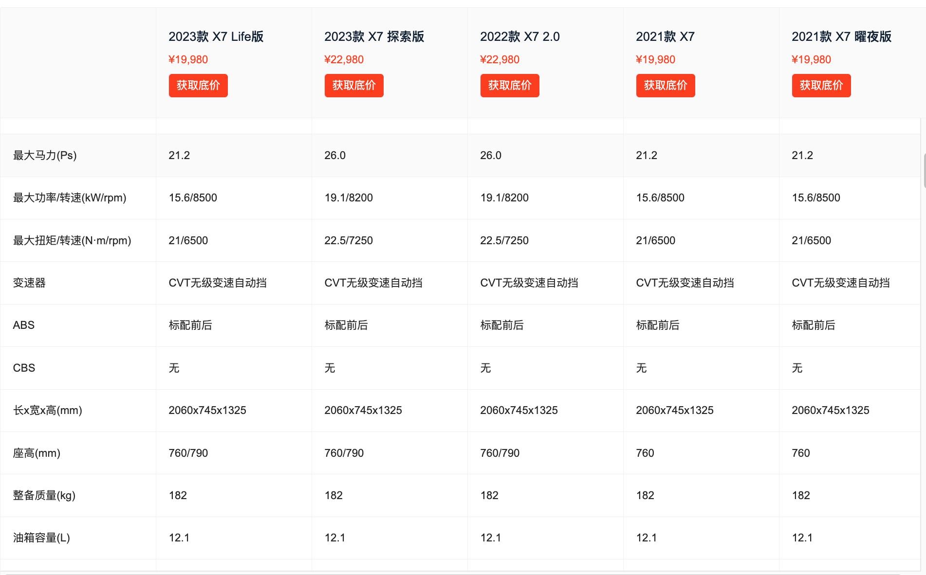 性能方面: 比亚乔X7搭载了一台单缸四冲程 水冷·250cc发动机,最大马力21Ps,最大扭矩为22Nm,拥有良好的加速表现,详细参数如图: