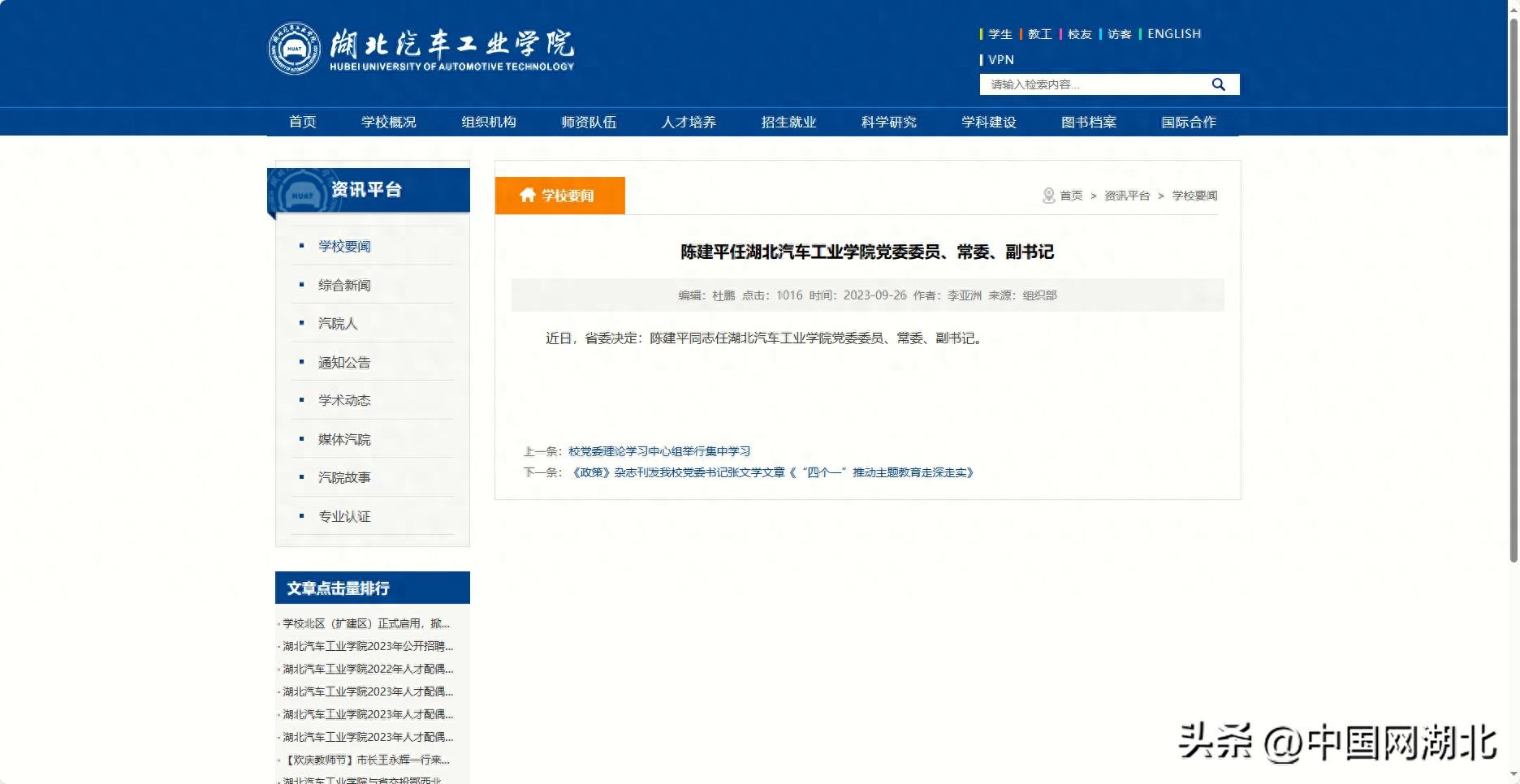 近日,湖北省委决定:陈建平同志任湖北汽车工业学院党委委员、常委、副书记。