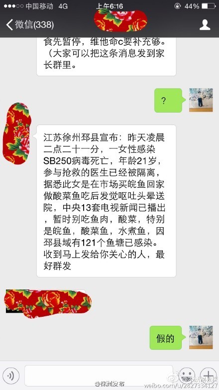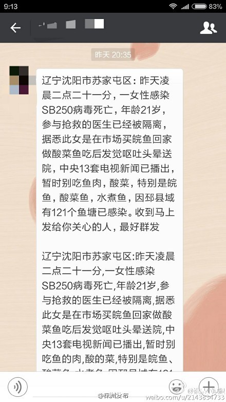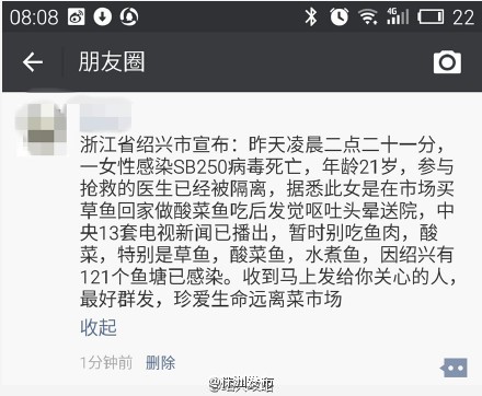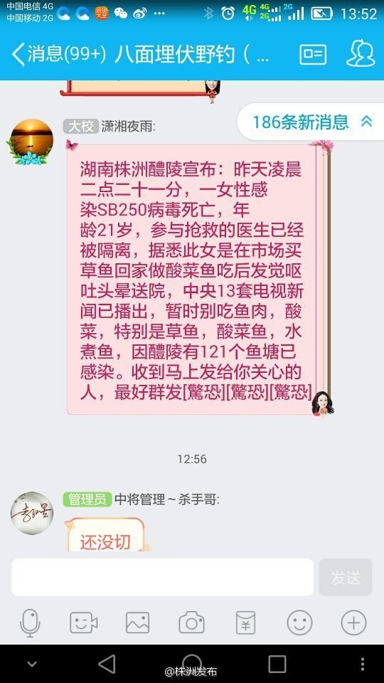 近日,一则信息在朋友圈传开,内容看起来十分吓人:“株洲醴陵……一女性感染SB250病毒死亡,年龄21岁,参与抢救的医生已经被隔离。据悉此女是在市场买草鱼回家做酸菜鱼,吃后发觉呕吐头晕送院……醴陵121个鱼塘感染这个病毒……”那么,事情到底是怎样的?