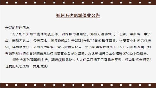 为了配合郑州市疫情防疫工作,很抱歉的通知您,郑州万达影城(二七店、中原店、惠济店、高新万达店、公园茂店、国贸360店)于2021年8月1日起暂停营业,恢复营业时间另行通知,详情请关注“郑州万达影城”官方微信公众号。您的影票退款也将于15日内原路返回。如有退款疑问请保留好购票凭证待恢复营业后予以咨询,万达影城将全面保障影迷利益不受损失。