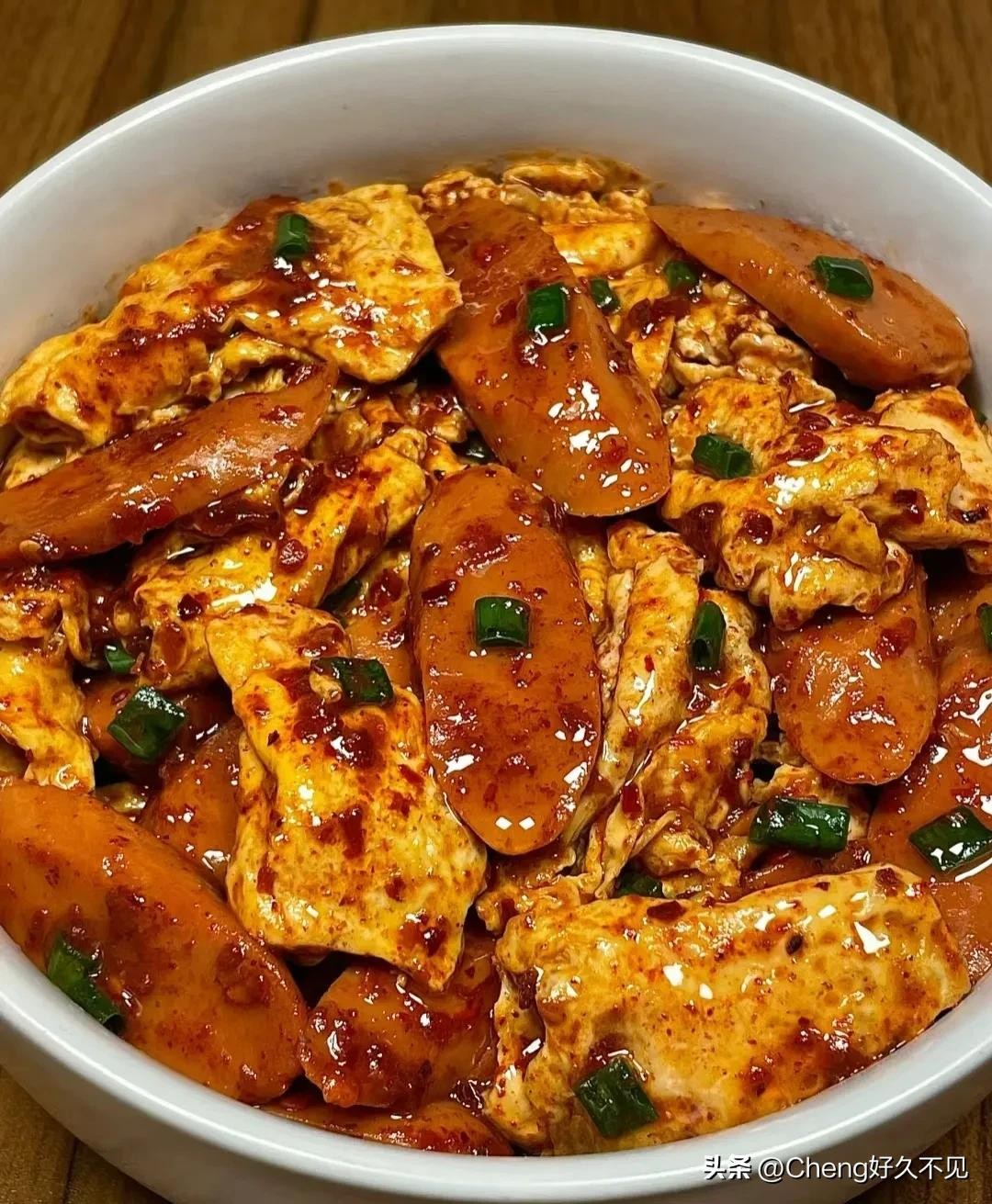 火腿炒鸡蛋,美味瞬间!金黄鸡蛋与诱人火腿在锅中翩翩起舞,香气四溢。咸鲜交织,口感丰富,每一口都是幸福的味道。
