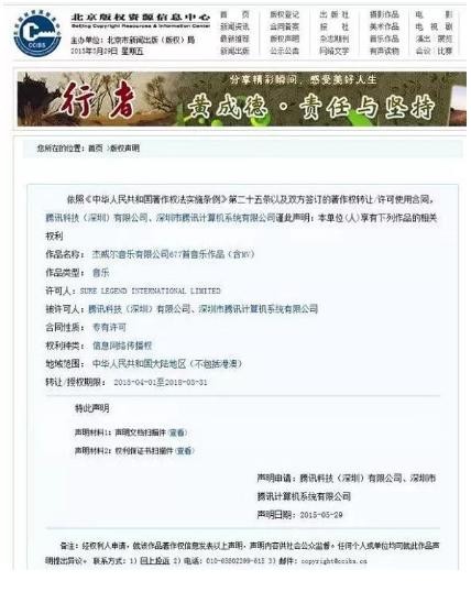 每经小编(微信号:nbdnews)注意到,北京版权资源信息中心2015年5月9日的一则版权声明显示,周杰伦所属唱片公司杰威尔音乐有限公旗下677首音乐作品(含MV)的独家授权归属腾讯科技(深圳)有限公司、深圳市腾讯计算机系统有限公司,合约期限为2015年4月1日至2018年3月31日。
