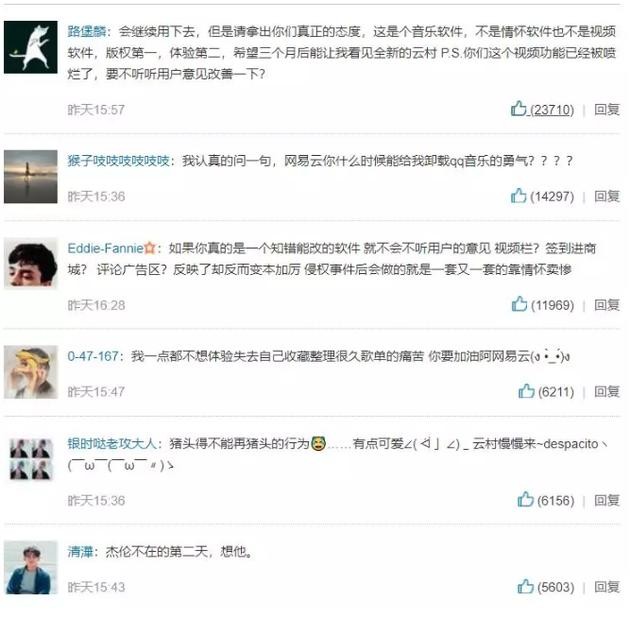 有用户在网易云音乐的公告下方留言:“请拿出你们真正的态度,这是个音乐软件,不是情怀软件也不是视频软件,版权第一,体验第二。”
