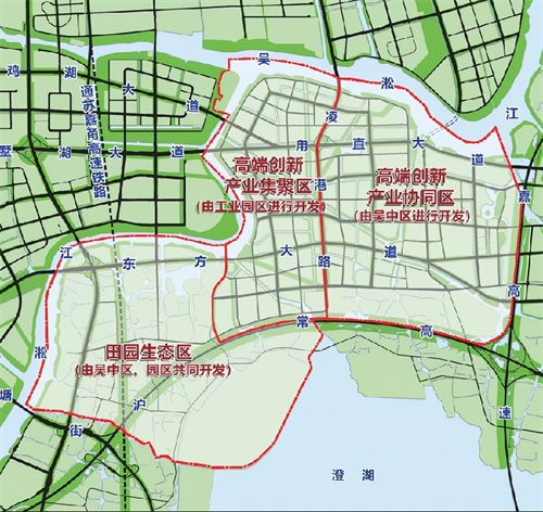 在吴淞江以南、澄湖以北区域划定26平方公里左右区域, 设立“协同发展核心区”,核心区由高端创新产业集聚区、高端创新产业协同区、田园生态区三部分组成。