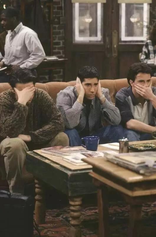 ▲ 眼熟吗!?对啦,这就是风靡全球20余年的美剧《老友记》(Friends)。剧中Ross决定要送走他的猴子Marcel的那天,三个人在咖啡馆里有这样一组姿势。他们的表情与动作,你眼熟吗?