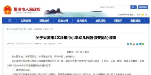 巢湖市中小学幼儿园暑期放假时间安排出炉