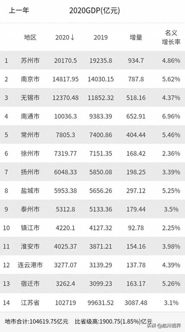 第二,南京作为省会城市,在江苏省的经济实力却不如苏州,在2020年江苏省城市GDP排名中,南京1.48万亿国内生产总值不敌江苏的2万亿。具体数据如下图:
