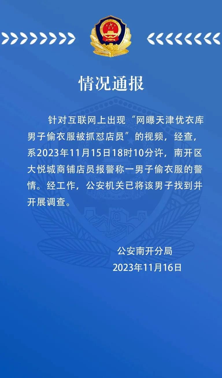 为了澄清事实真相,公安南开分局发布了情况通报。通报中表示,警方已经查明,这一事件发生在11月15日18时10分许,南开区大悦城商铺店员报警称一男子涉嫌偷窃衣物。经过工作,公安机关已将该男子找到并开展了调查。