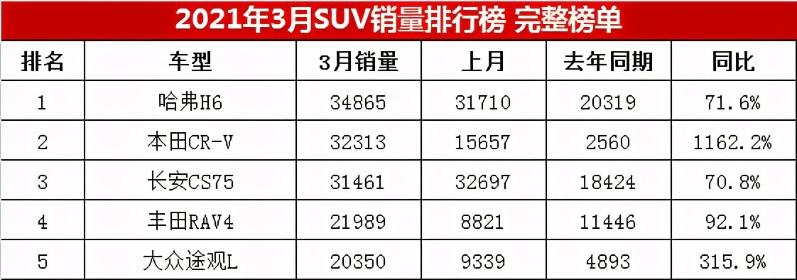 3月SUV销量排行榜完整版,CR-V超长安CS75,博越跌出前十?