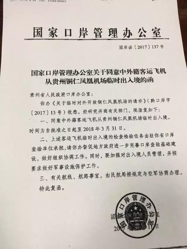说到这,不少小伙伴肯定激动了,尤其是铜仁的小伙伴,这不就是“国际机场”吗?不过,不少细心的小伙伴也注意到,国家口岸管理办公室的函上标明为“临时出入境”,而且,临时对外开放的时间是自批复之日(2017年11月11日)起到2018年3月31日。