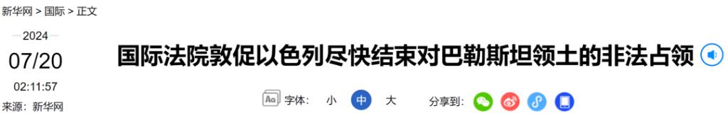 新华社海牙 7 月 19 日电 联合国国际法院 19 日发表一项咨询意见,敦促以色列尽快结束对巴勒斯坦领土的非法占领。
