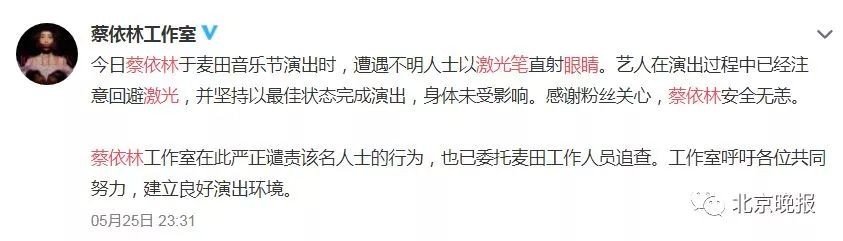 当天晚11时,蔡依林工作室官方微博发消息称:“蔡依林于麦田音乐节演出时,遭遇不明人士以激光笔直射眼睛。艺人在演出过程中已经注意回避激光,并坚持以最佳状态完成演出,身体未受影响。感谢粉丝关心,蔡依林安全无恙。”