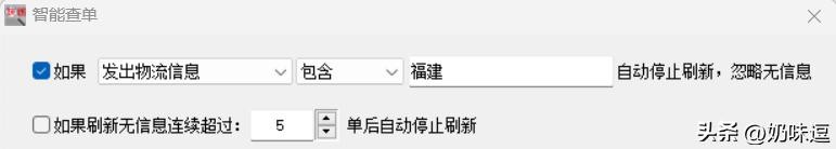 2.在智能查单设置中,根据需要选择停止刷新的条件(如物流信息包含特定地区或无信息单号连续超过设定数量)