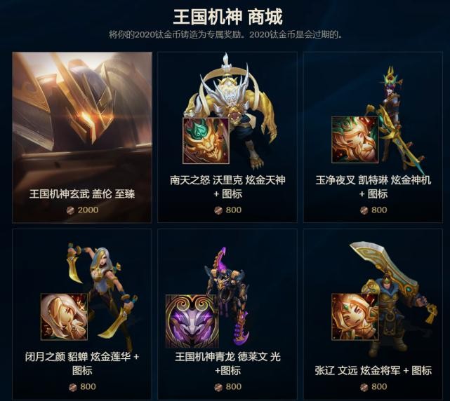 至臻皮肤的获取方式还是跟以前一样,可以参加每天的任务来存一下钛金币,其中兑换王国机神玄武盖伦至臻皮肤需要花费2000的钛金币,可以通过钛金法球来兑换获取,同时也可以完成任务获取,也就是我们俗称的肝。同时在王国机神商城,还可以兑换到一些新年限定皮肤的炫彩,比如南天之怒狼人、张辽德玛、王国机神德莱文的炫彩等等等。