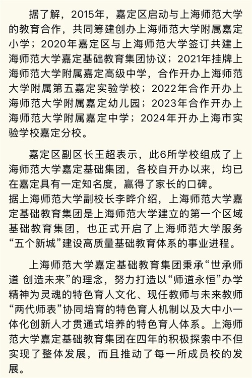 12月19日,《上海市嘉定区人民政府、上海师范大学进一步深化教育合作的框架协议》《上海市嘉定区教育局、上海师范大学合作举办上海师范大学附属中学嘉定新城分校的协议》签订,嘉定将新增一所市实验性示范性高中。