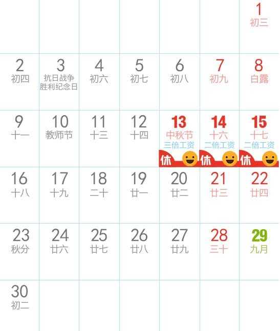 七、国庆节:10月1日至7日放假调休,共7天。9月29日(星期日)、10月12日(星期六)上班。