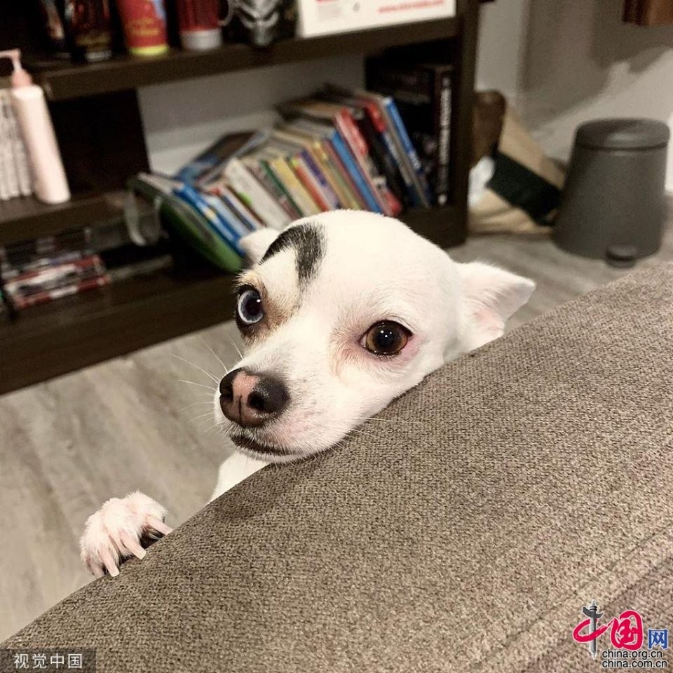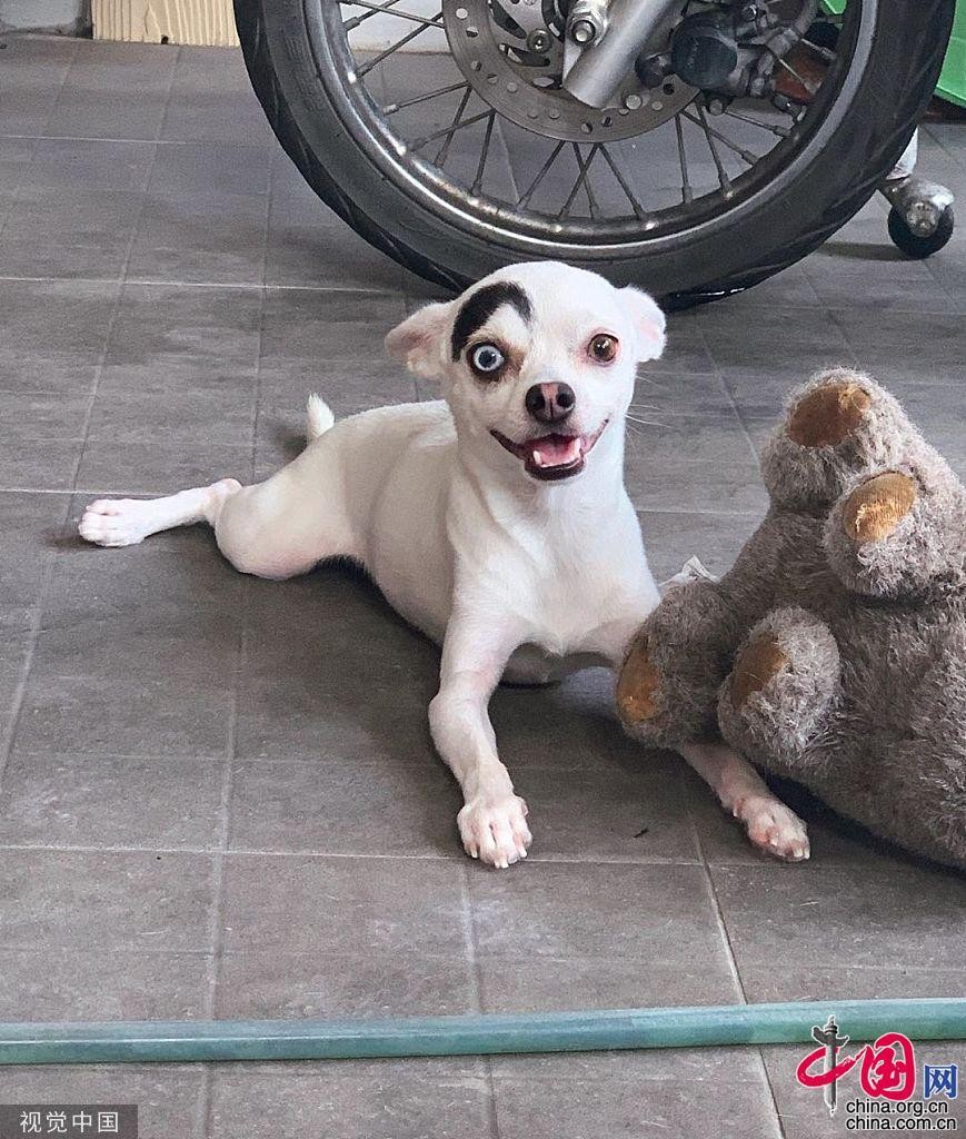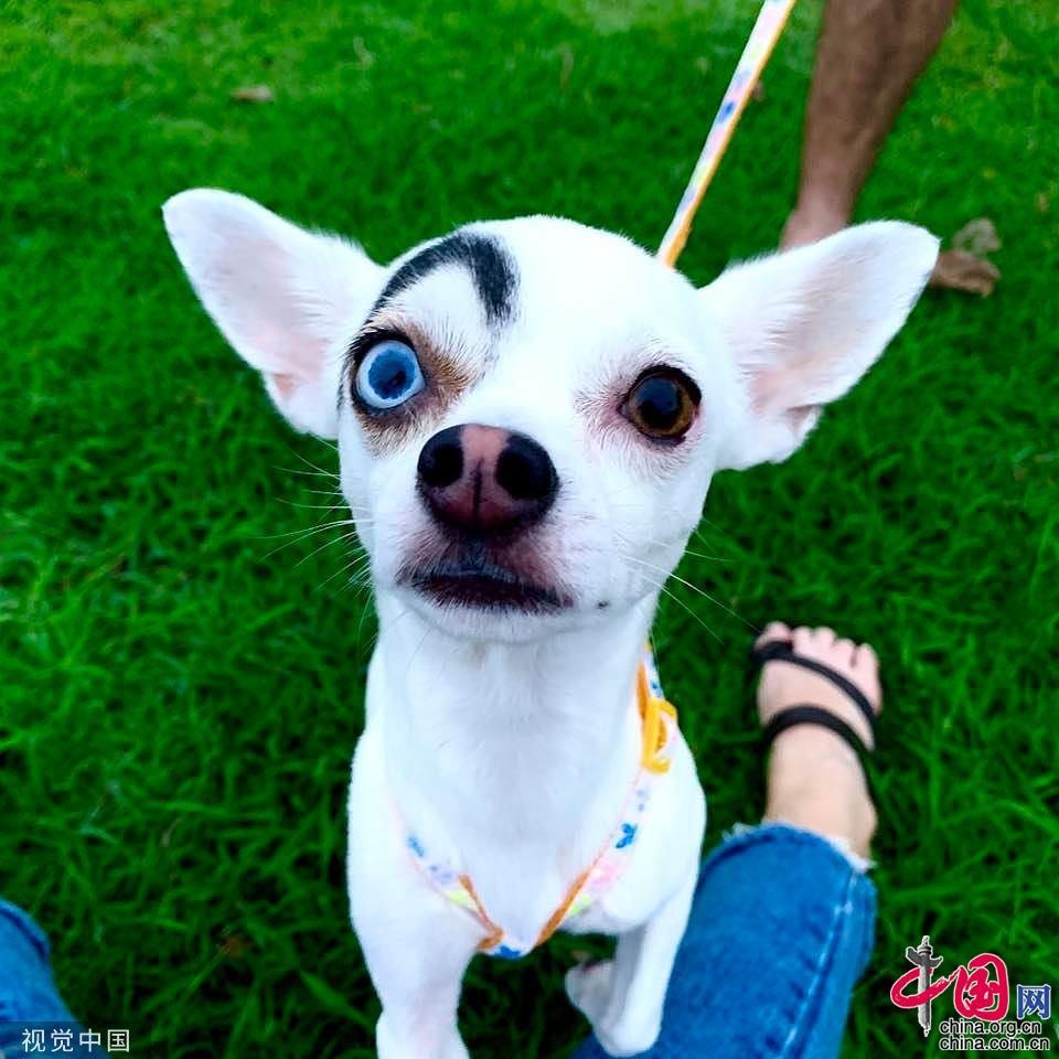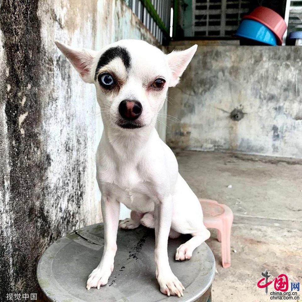 当地时间2019年8月27日,泰国,一只2岁大的吉娃娃因为独特的外形成为“网红”。救助犬Lucky的脸部看起来像两只完全不一样的狗,一半是吉娃娃,一半像007电影中的反派。主人查理斯·菲卡·查把它抱回家后,把照片发布到了社交网站脸书上面,意想不到的获得了11000个赞和超过600多条评论。有些评论者认为lucky脸上的“眉毛”是查理斯用笔或者PS画上去的。 图片作者:LuckiRy/Cover Images/视觉中国