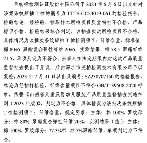 处罚事由显示,该公司销售的MUJI品牌孩童条纹短袖T恤纤维含量不符合要求。
