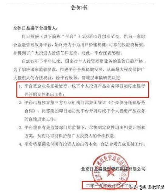 2019年4月,日益盛发公告称公司平台要进行良退,简单来说就是投资平台不运营了,会退钱给把钱放在平台上的客户们,但却没有写清退钱时间。