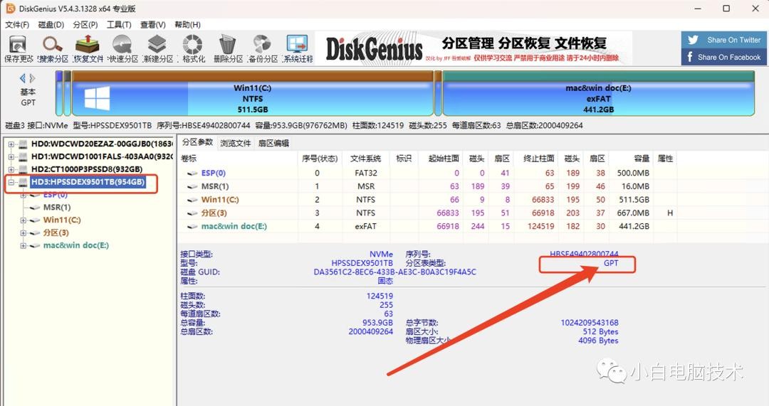 WinPE界面时,打开Disk Genius,选中安装了系统的硬盘,就能看到分区类型为GPT,则为UEFI开机引导方式。