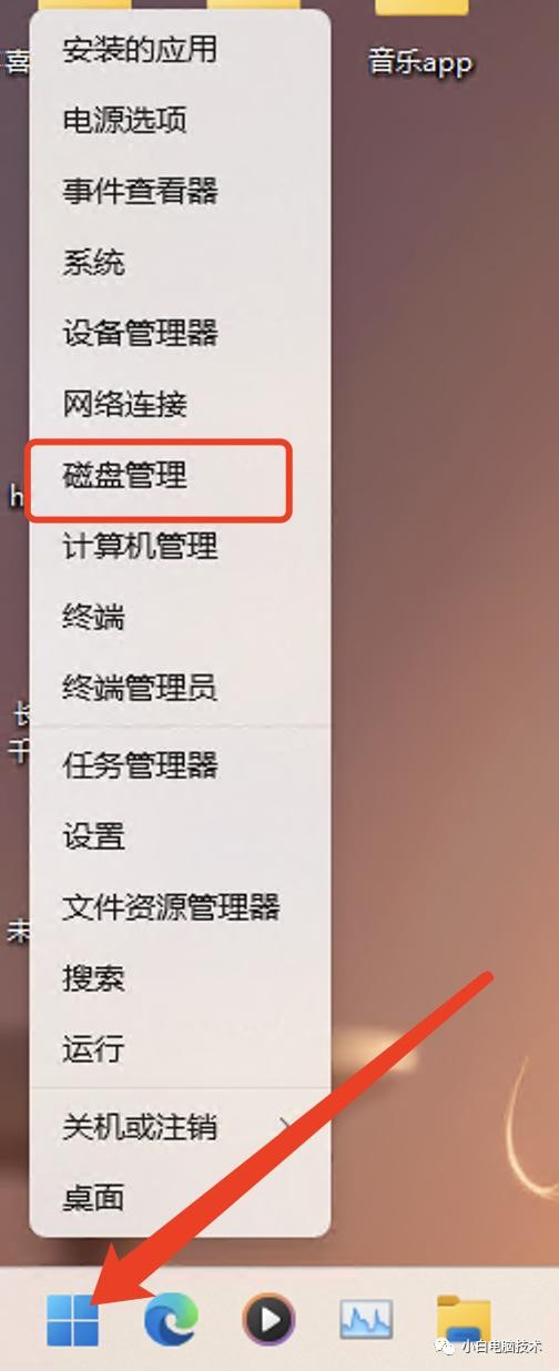 电脑正常开机之后,在开始菜单点击鼠标右键,进入【磁盘管理】