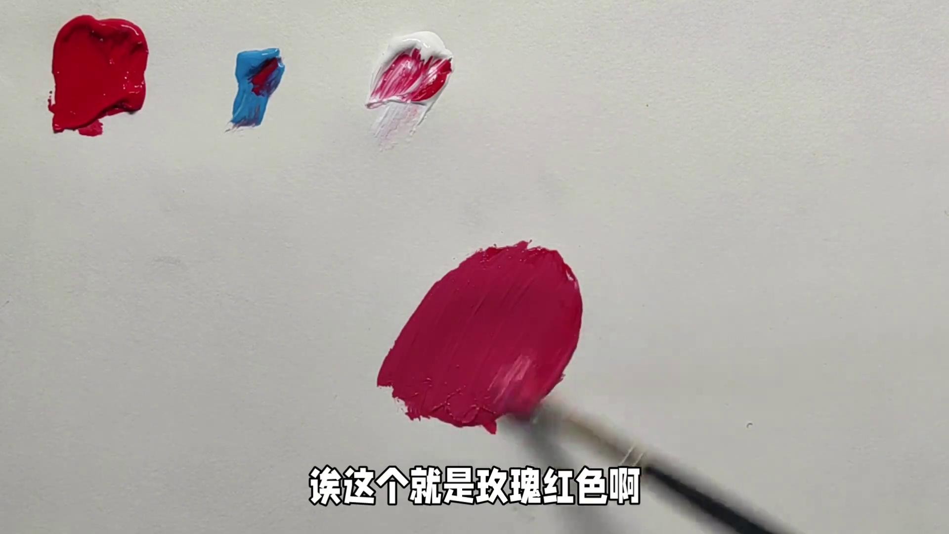 - 那么蓝色一定要少,稍微加一丁点儿,加一丁点儿蓝色,不要多加一丁点。看本来这颜色就少,然后就弄了一点,这个时候要加一点白,加一点白色,再加一点白色,这个就是玫瑰红色,非常的简单。