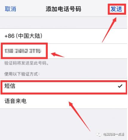 7、进入添加号码的界面,添加新的电话号码,选择短信验证,然后点击右上角发送;