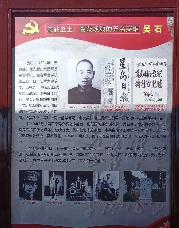 吴石(1894—1950)是福建福州人,1911年参加过辛亥革命。后在武昌预备军官学校和保定陆军军官学校前后受业4年,均以全校第一毕业。加入国民革命军后,在北伐军总参部任作战科长。