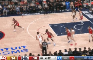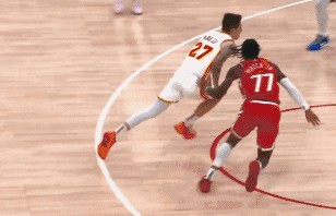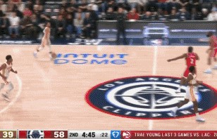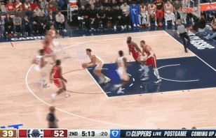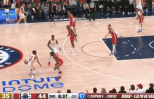 特雷杨弧顶接球,莱昂纳德领防迫使他无法投篮,随后跳起展开双臂封锁传球路线,特雷杨被吓得传给丹尼尔斯的球右偏失误,哈登助琼斯上演今日最佳扣篮。