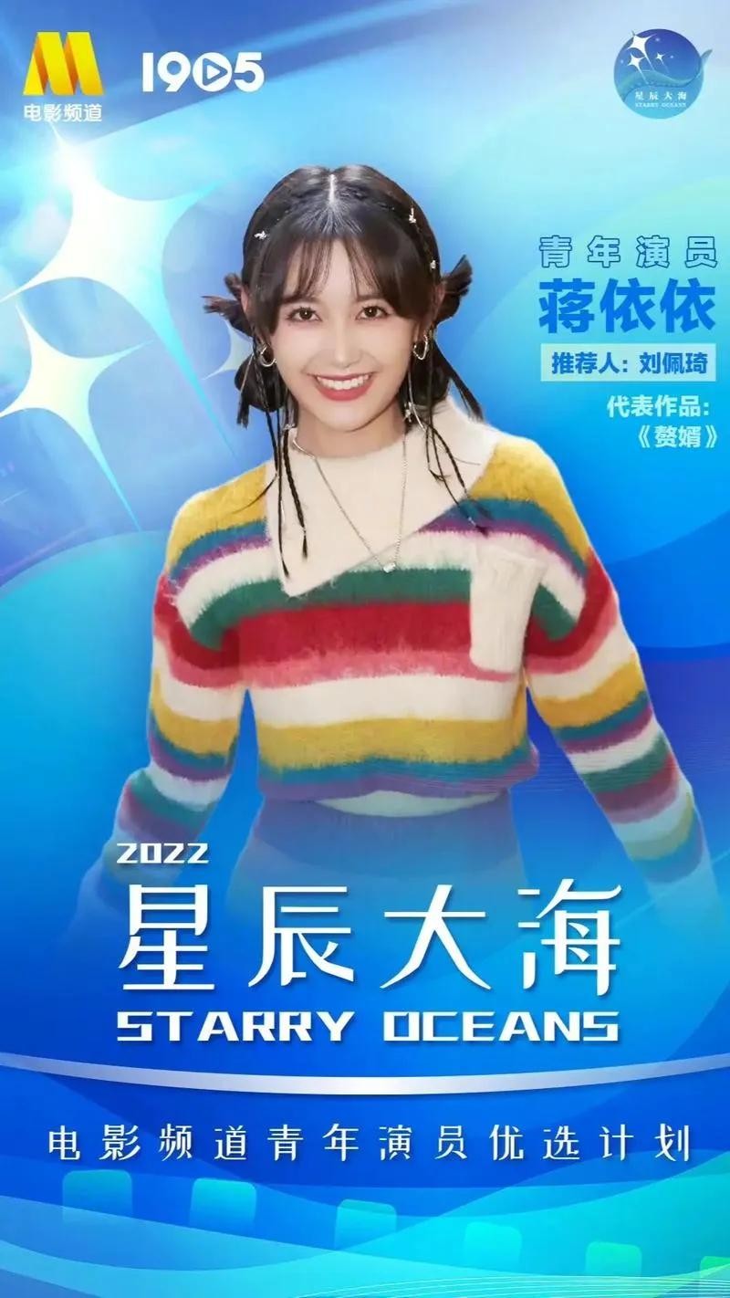 其他成就:2022年11月12日,蒋依依当选2022电影频道星辰大海青年演员优选计划星辰大海·三天三夜创作采风活动优秀学员,这是对她演艺事业的一种肯定和鼓励。