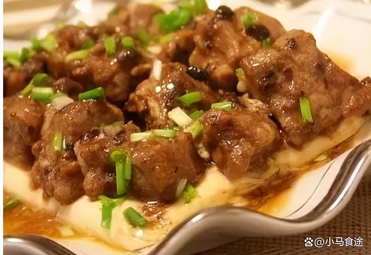 3. 豆腐先放空盘内,再将排骨放在上面,上汽蒸10分钟左右,取出撒上葱花,美味即成。