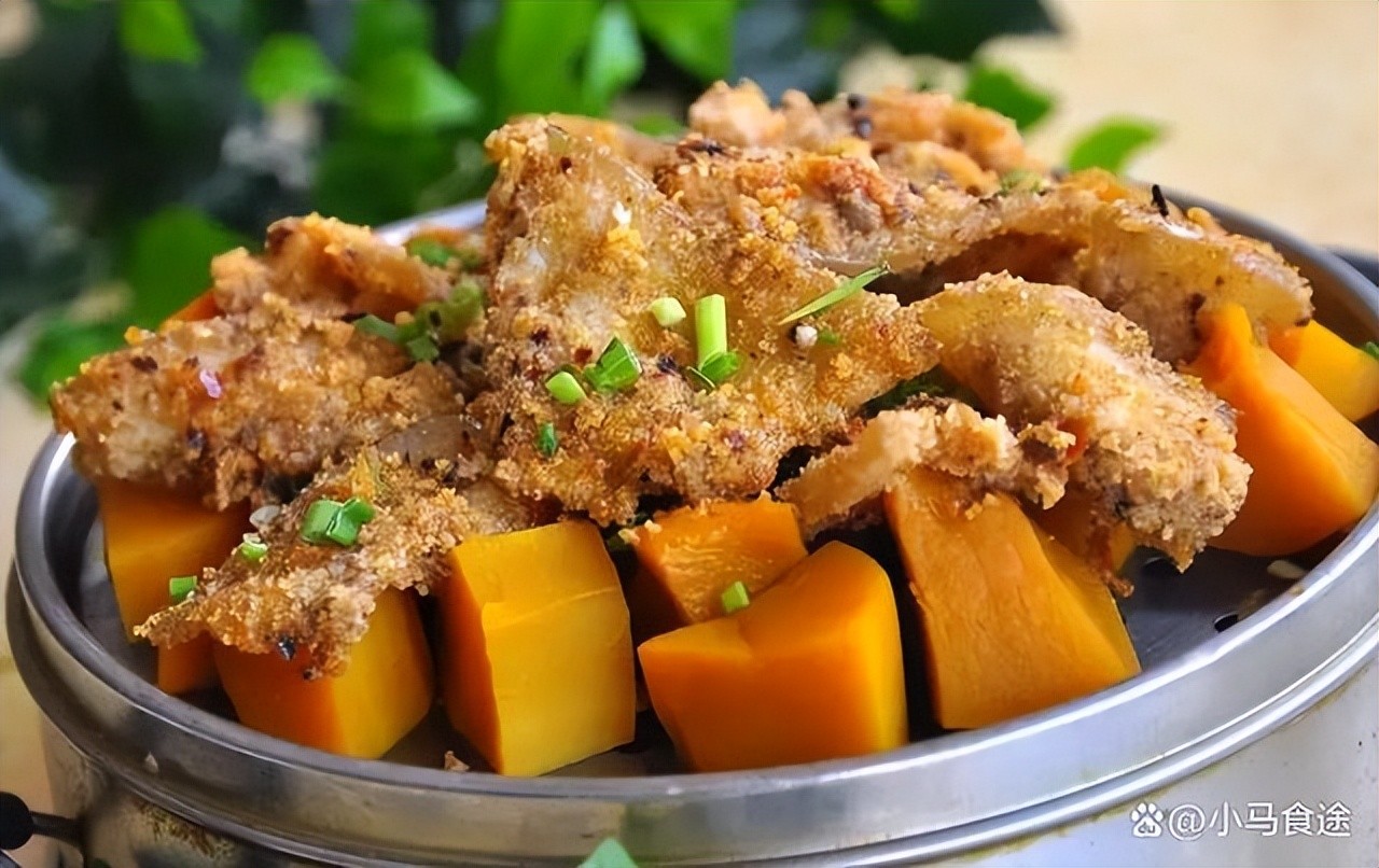用南瓜做底的粉蒸肉香而不腻,润而不油,一起蒸出来的南瓜更好吃,粉糯香甜中夹杂着肉香,比粉蒸肉还好吃。