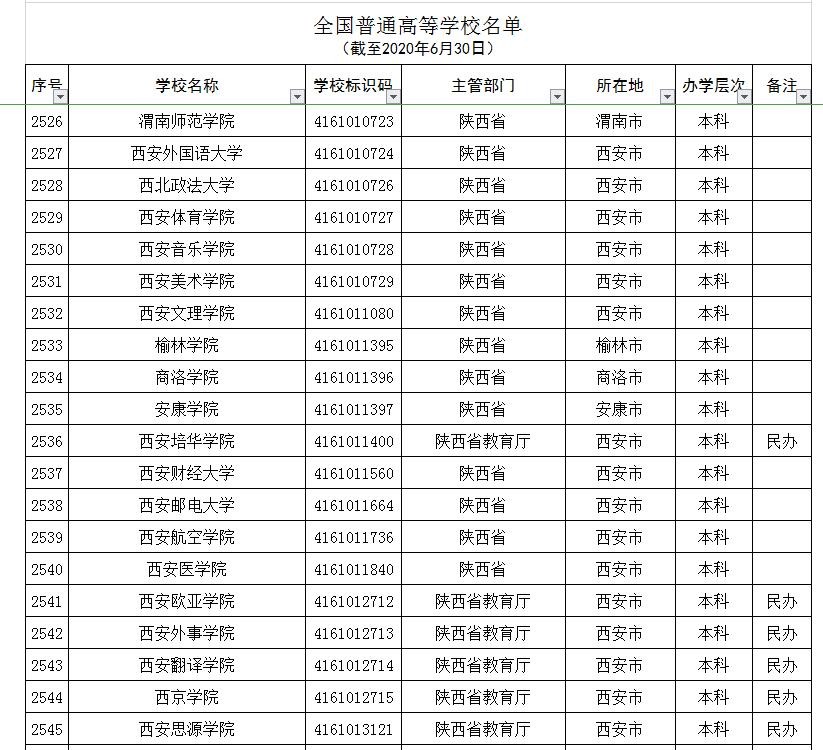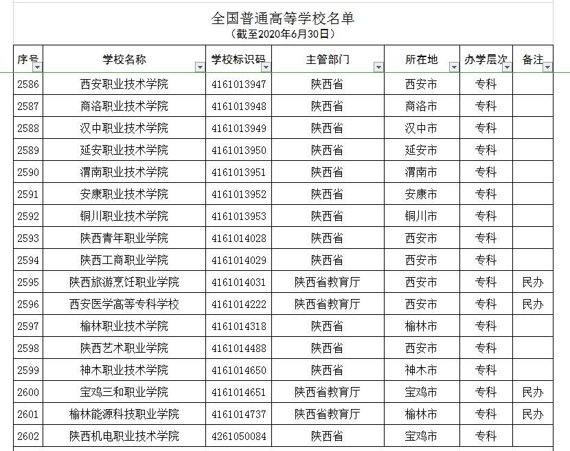 至2020年6月30日,教育部公布的2740所全国普通高等学校中,陕西省有96所: