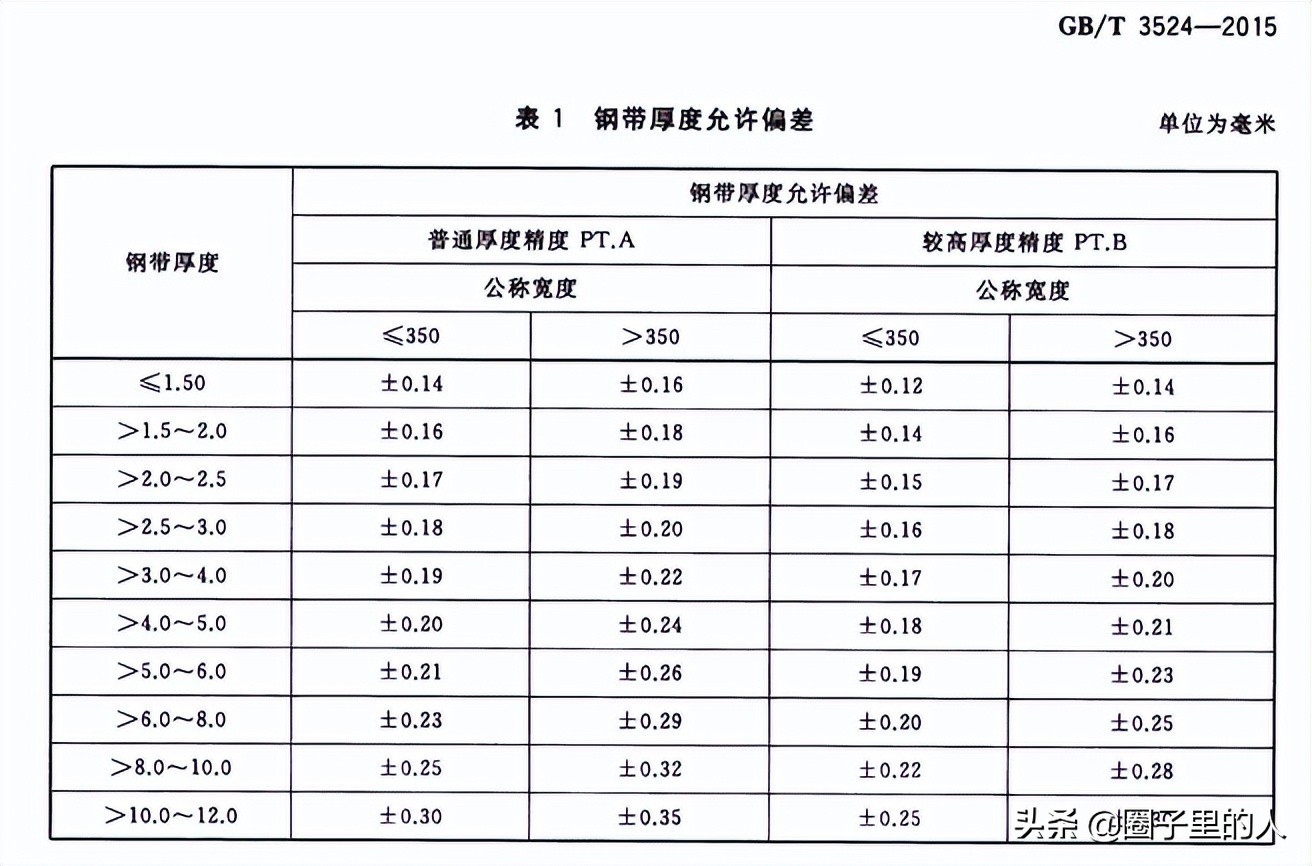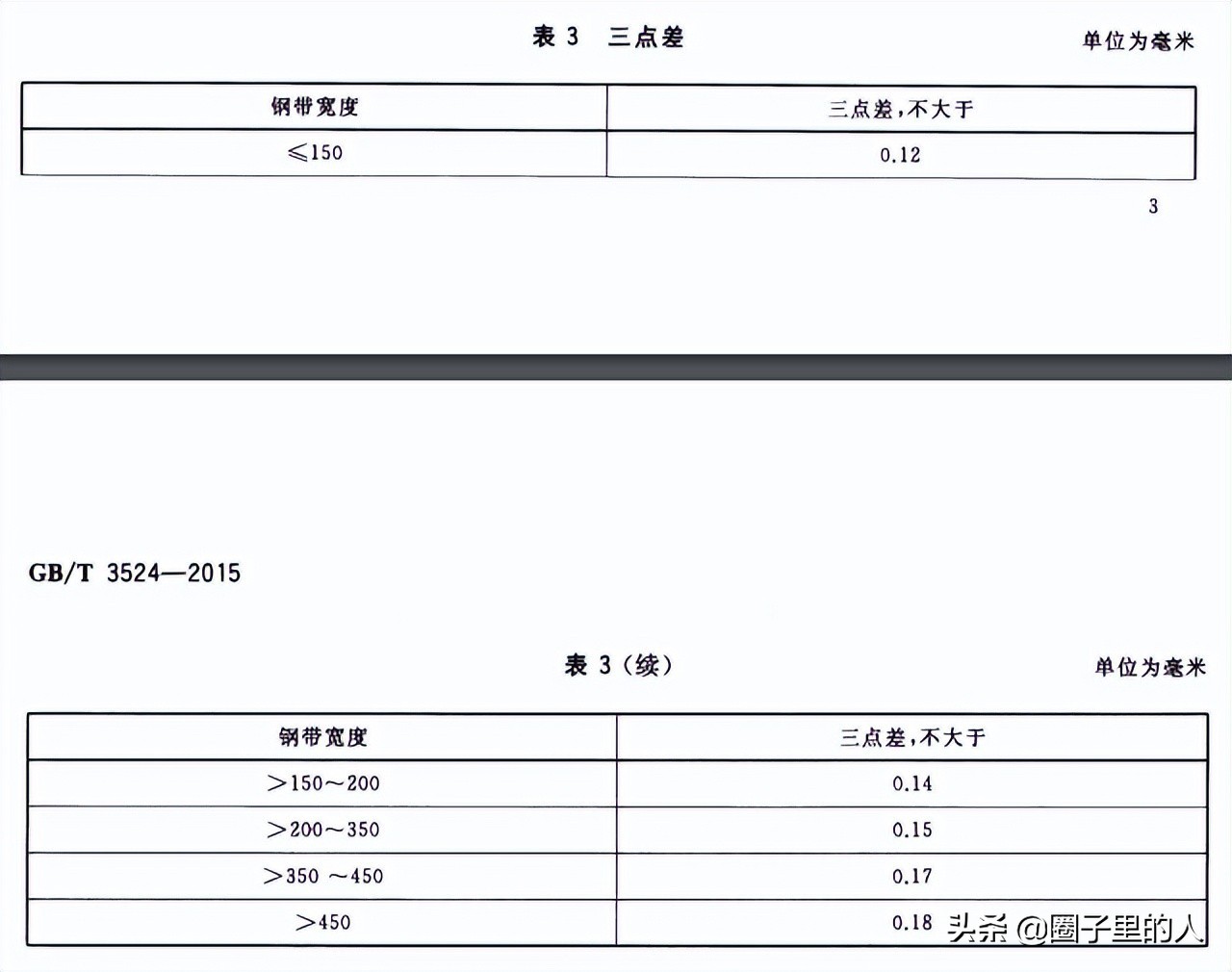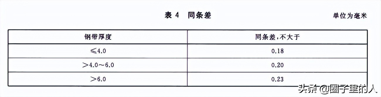 4、钢带轧制方向的厚度应均匀,在同一条直线任意测定三点,其最大差值(同跳差)应符合表4的规定: