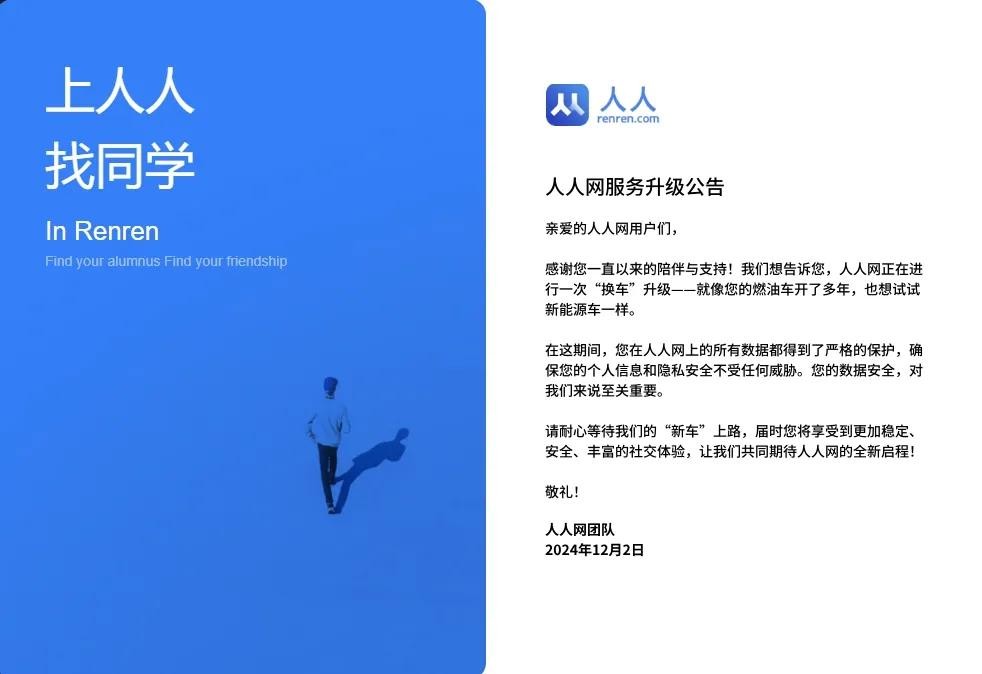 12月2日晚,人人网官网发布的服务升级公告显示,“人人网正在进行一次‘换车’升级……请耐心等待我们的‘新车’上路,届时您将享受到更加稳定、安全、丰富的社交体验……”