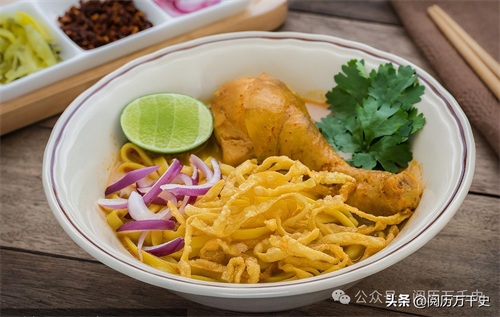 泰北特色的咖喱面是清莱的标志性菜肴之一,由黄咖喱、椰浆和鸡肉或牛肉等烹制而成,上面撒上炸面条、葱花、香菜和酸柑汁,味道丰富。