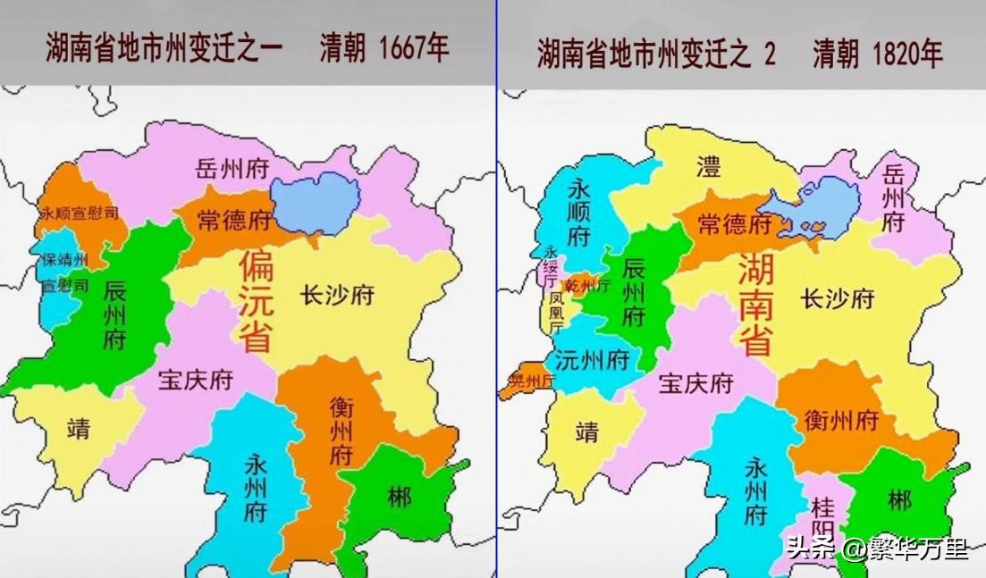 明朝统治时期,湖广省继续沿用,不过,管辖范围大体上就是现在的湖南、湖北。17世纪中期,清朝消灭了各地的农民起义军和南明势力,确立了对各地的统治。湖广省面积辽阔、人口众多。水网密布,管理难度太大。1667年,康熙皇帝在位的第6年,清朝撤销了湖广省,组建了湖南省、湖北省、湖南省组建以后,省会设立在长沙府。