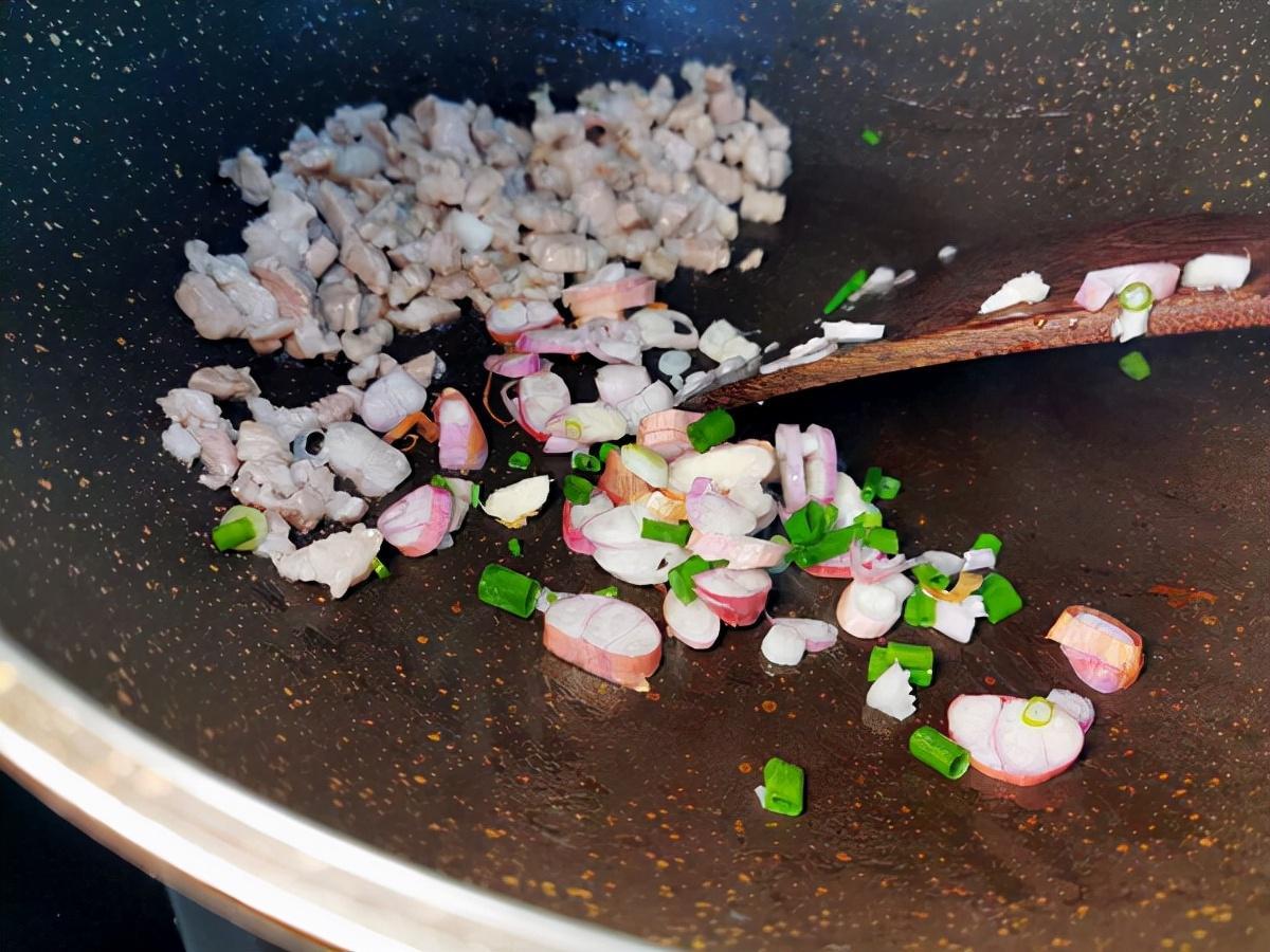 锅中下少许油爆香葱与红葱头及猪肉丁。随后加入酱油、胡椒粉、糖炒至入味干爽,即可取出放凉备用。