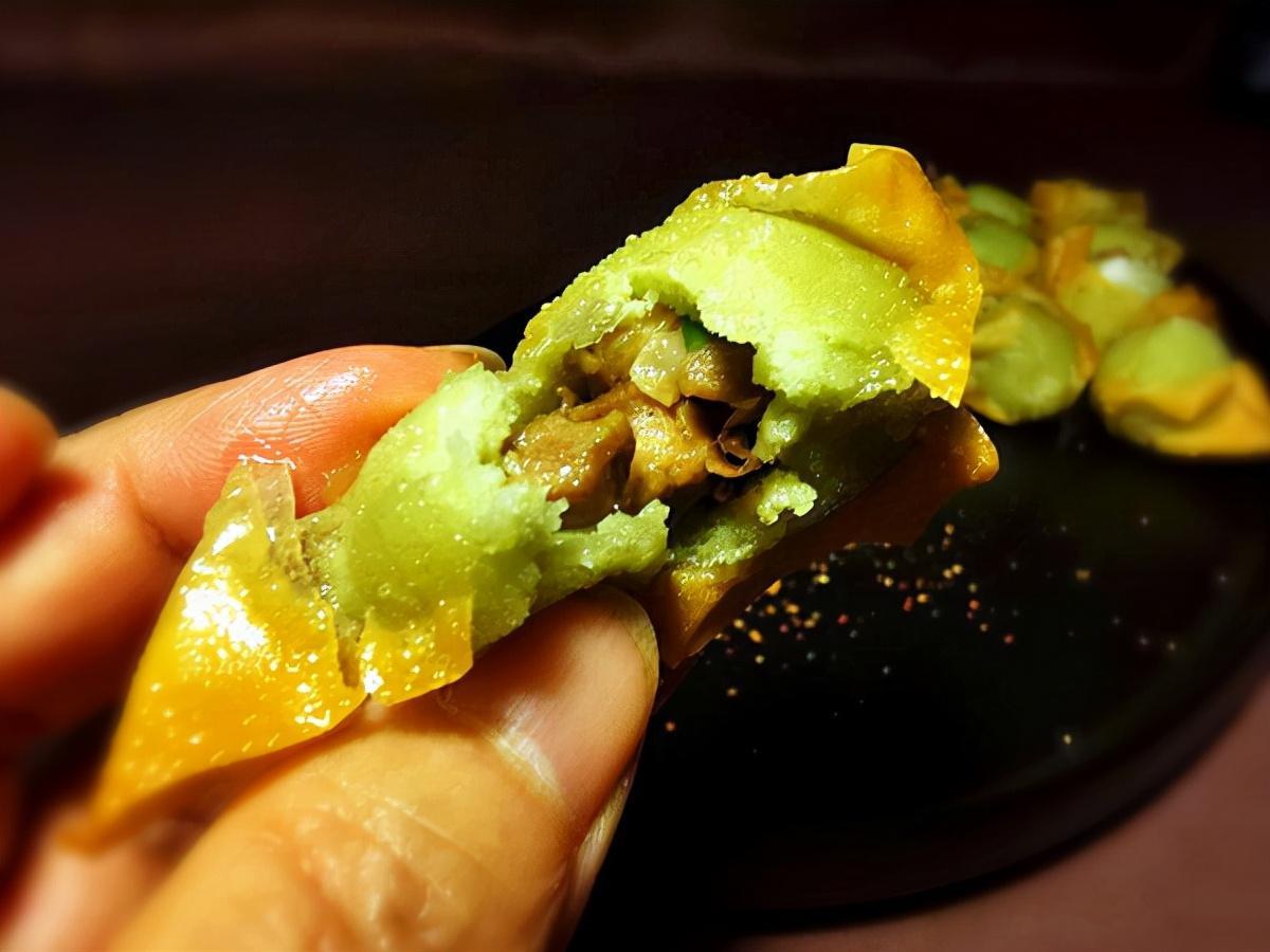 看它不冒烟,也要稍等一下,否则烫到舌头,可是黏住又甩不掉。温热是最佳品尝时间,先咬开一小口,透出热气,连香气都跟着出来,外皮酥中带一丝丝的咸,这是由馄饨皮产生出来的。熟馅料较无汤汁,咸香味道伴着软糯的汤圆,别有一番风味在其中。