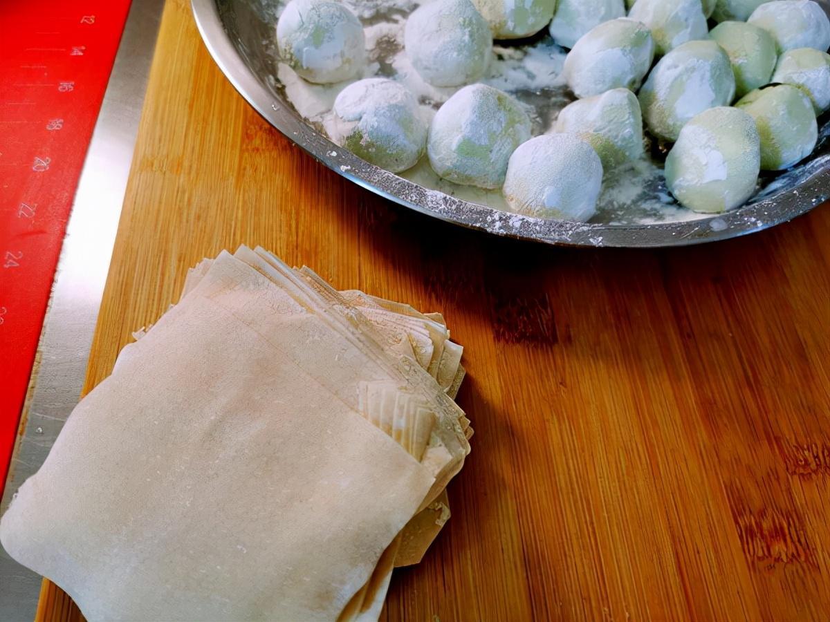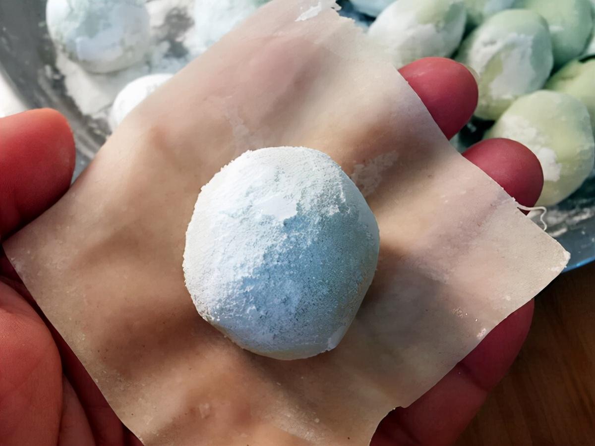 糯米粉中加入大麦苗粉,冲入热水,揉成团,醒15分钟后,分成若干小剂子,搓圆备用。