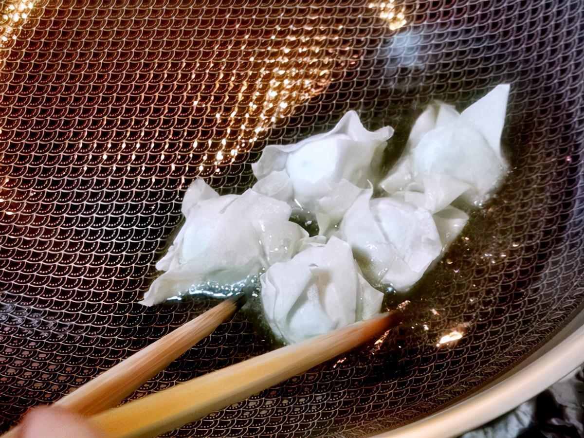 五成油温,从锅边慢慢滑入油锅中,千万别用“高空抛物”或是“定点投篮” 太危险,会炸锅。油温控制在中小火,耐心慢炸,就不会“引爆” 。待汤圆外皮起酥,馄饨皮成焦黄色就可以取出,控油后,就可以开动了。
